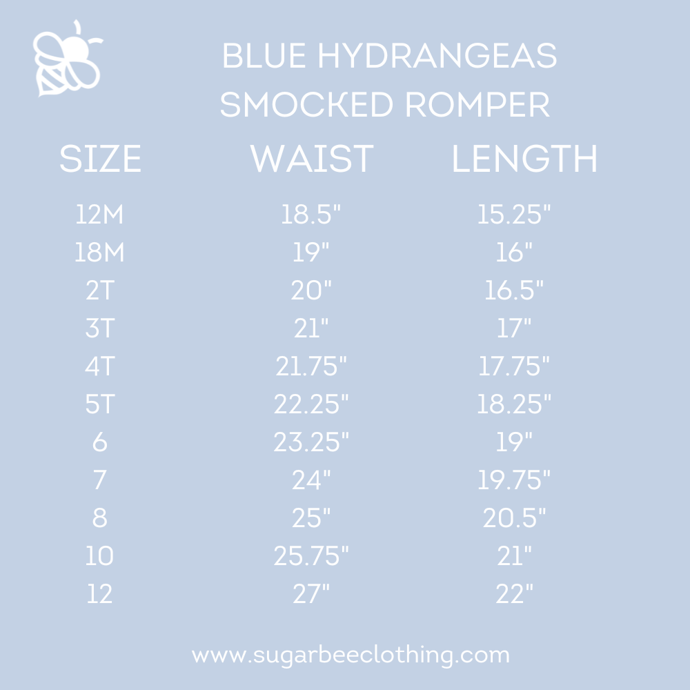 Get ready to steal the show in our Rosie smocked romper featuring our new Blue Hydrangeas design. Perfect for all of your spring activities and gatherings, this romper is sure to make you the center of attention. Stay stylish and comfortable in the cutest smocked romper around!