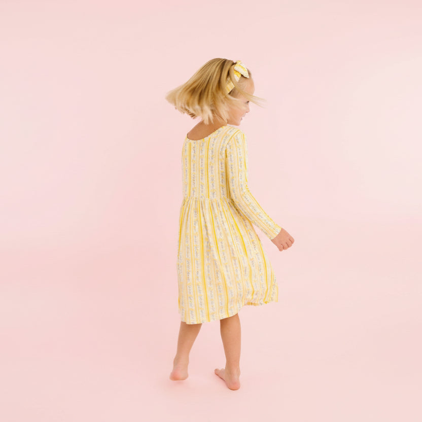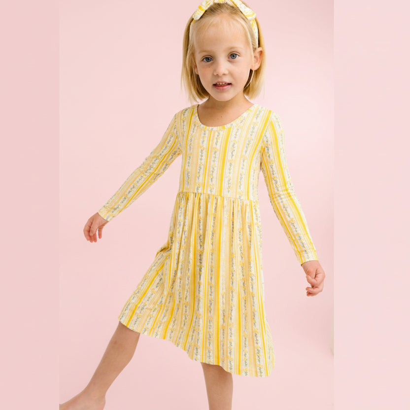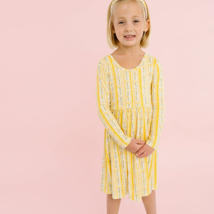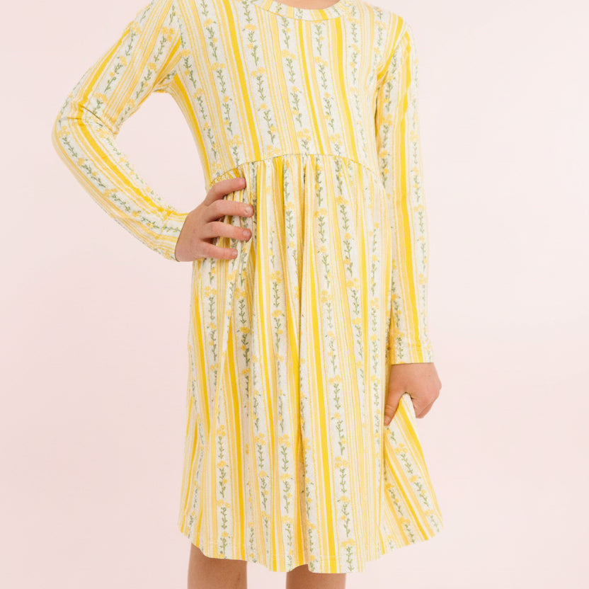 Brighten up her wardrobe with the Sunny Meadow Stripe Bamboo Dress, where comfort meets sunshine! Designed for all-day play and effortless style, this dress features a cheerful yellow and white vertical stripe pattern accented by delicate floral sprigs. The classic scoop neck and long-sleeve silhouette make it a versatile staple for transitioning between seasons, while the flowy skirt is perfect for every "watch me twirl" moment.