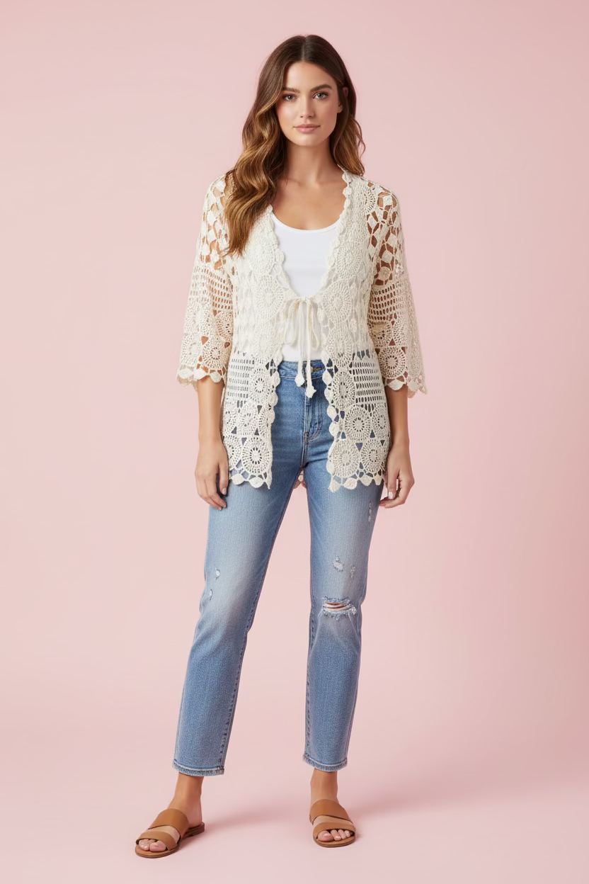 Our Front Tie Crochet Cardigan offers a sophisticated take on traditional knitwear. Characterized by a geometric open-stitch pattern, this sweater provides a unique dimension to any ensemble.