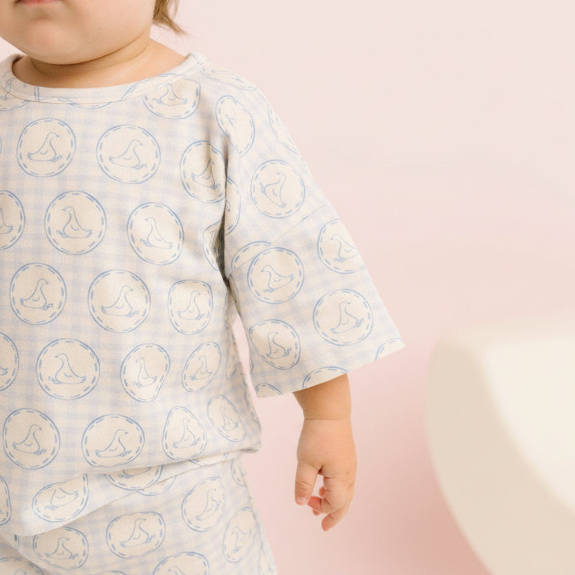 Bring a touch of timeless countryside charm to your child's everyday wardrobe with our Cottage Goose Slouchy Set. This two-piece daywear ensemble features a classic light blue gingham check pattern, accented by sweet, vintage-inspired illustrations of geese in circular frames. Swapping the traditional snug fit for a trendy, oversized silhouette, this set is designed for the modern kid who values both style and maximum comfort during their daily adventures.