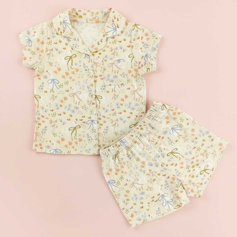 Elevate your little one's daytime style with our Darling Goose Short Button-Up Set. This sophisticated two-piece ensemble features our signature whimsical print—a delicate meadow of peach florals, spring sprigs, and those iconic "darling geese" adorned with pastel bows. With its classic collared silhouette and matching shorts, this set offers a polished, vintage-inspired look that doesn’t compromise on play-ready comfort.