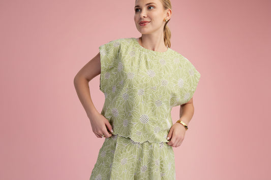 Round Neck Short Sleeve Scallop Hem Embroidery Top