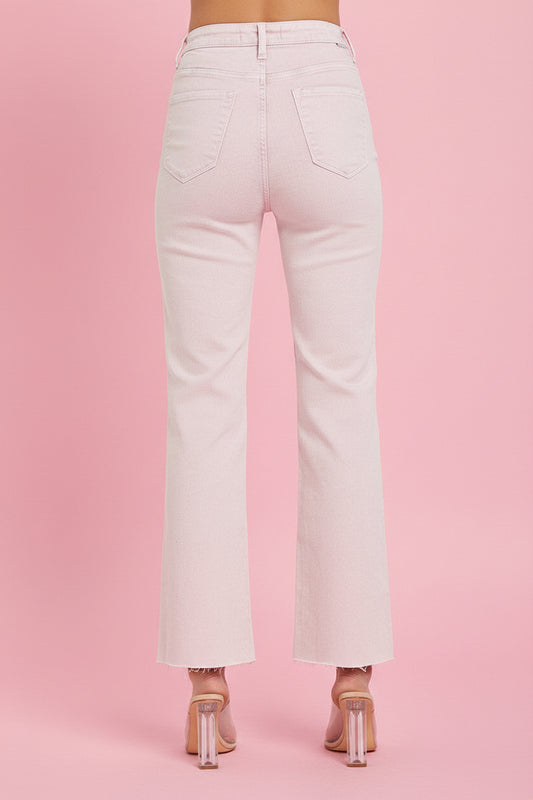 Risen Pink High-Rise Raw Hem Straight Leg Jeans with Side Slit