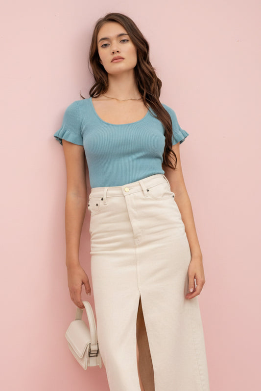 Scoop Neck Ribbed Knit Short Sleeve Top with Lettuce Hem
