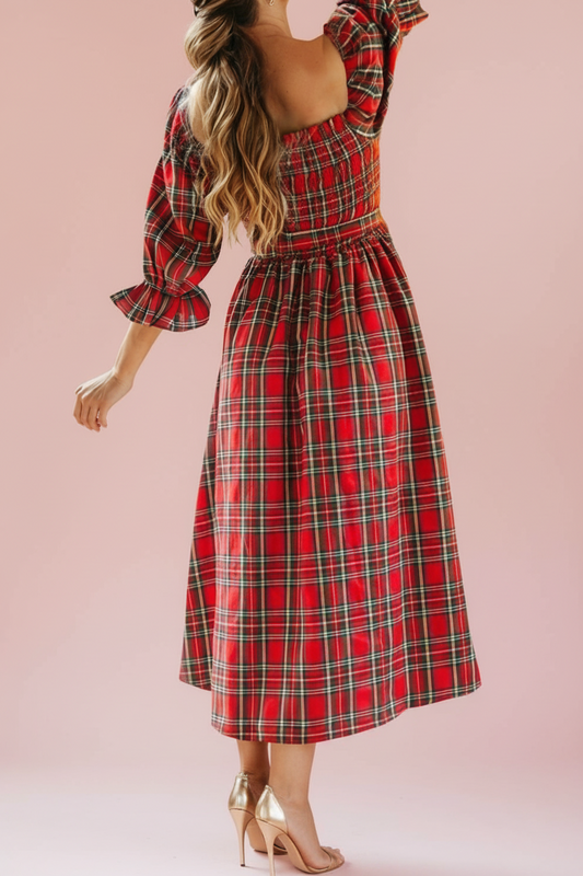 Plaid Square Neck Christmas Flare Dress