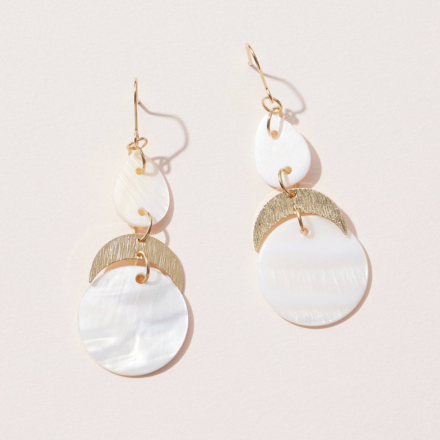 Crafted with three gorgeous pieces of Mother of Pearl, these earrings are the perfect addition to any jewelry collection.