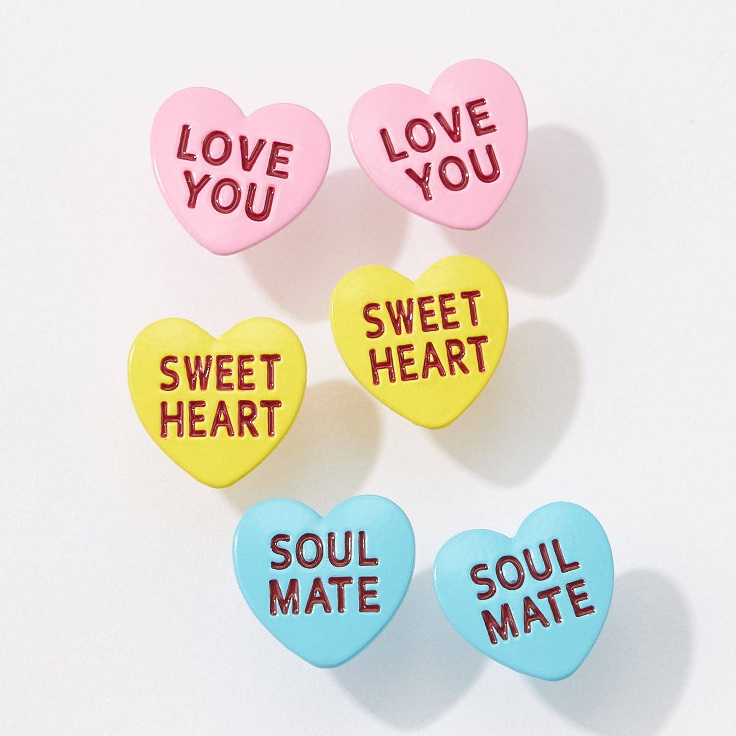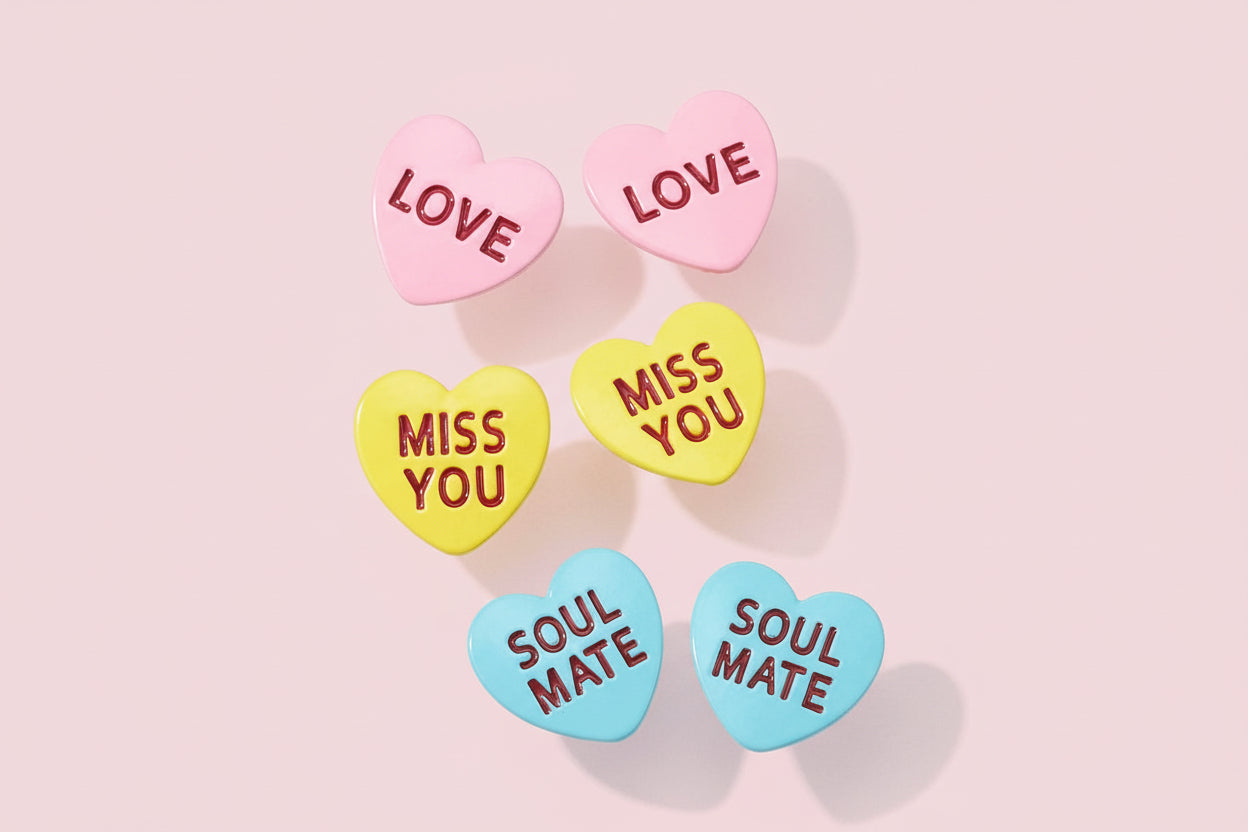 Sweet, playful, and full of personality, these heart-shaped post earrings add a fun pop to any look. Each pair features a colorful, candy-inspired heart with a loving phrase like “Kiss Me,” “XOXO,” or “Be Mine.” Lightweight and easy to wear, they’re perfect for everyday styling, gifting, or adding a little charm to your jewelry rotation.