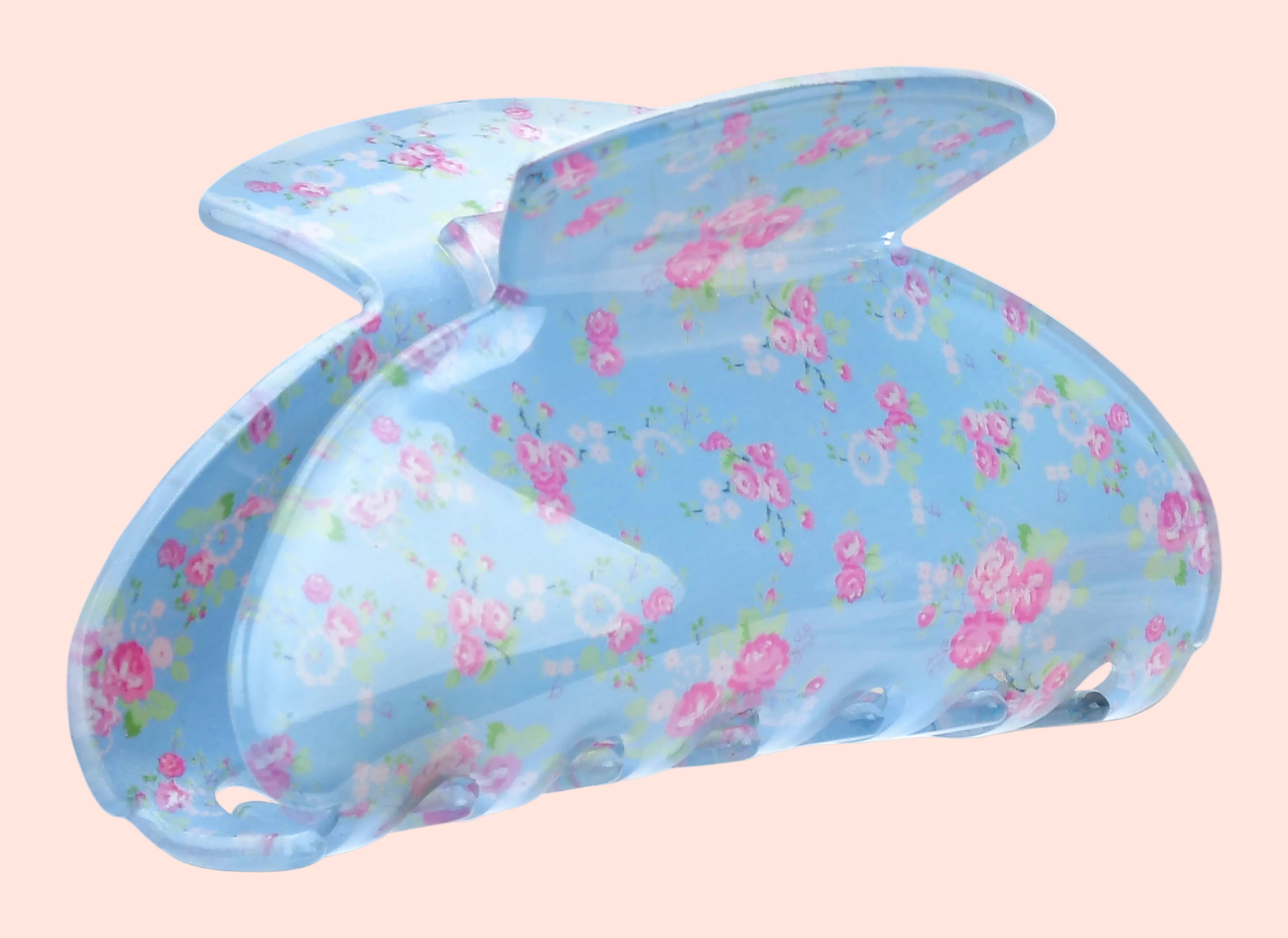 The soft blue base with a pink floral print gives sweet coastal energy, while the claw-style hold keeps hair up and out of the way (aka: more play, less fuss). Itâs also giftable, easy to display, and perfect for your shopâs accessory momentâhello clarity and easy add-on profit.