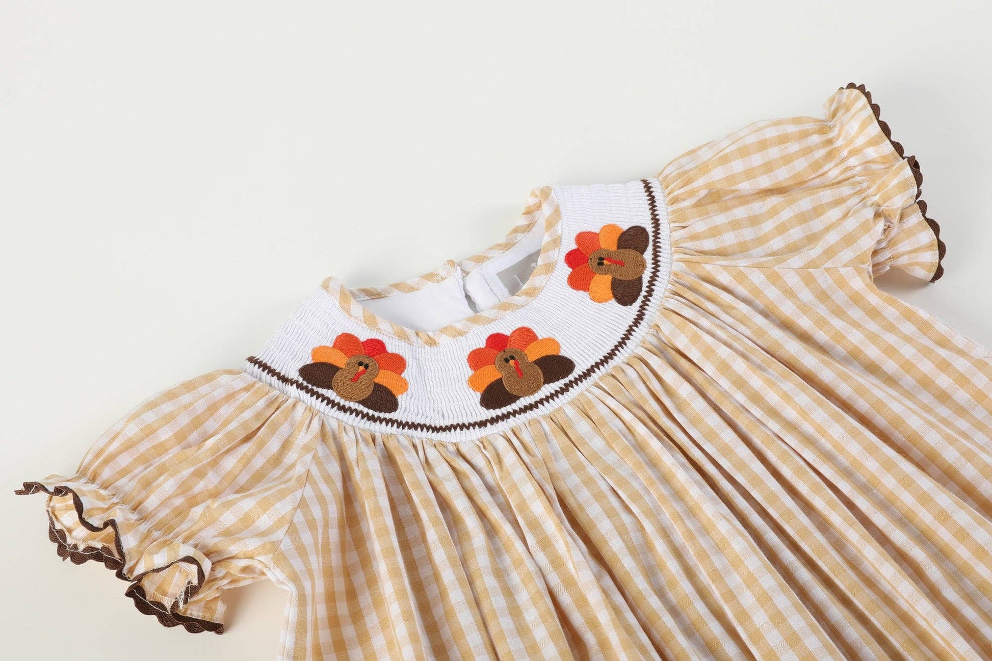 Capture the spirit of Thanksgiving with our Brown Gingham Turkey Smocked Bishop Dress. This enchanting ensemble features a beautifully smocked neckline adorned with delicately embroidered turkeys, adding a festive touch to your little girl's celebration. The pretty brown gingham evokes the warmth of autumn, making it a perfect choice for creating cherished memories during this season of gratitude and joy.