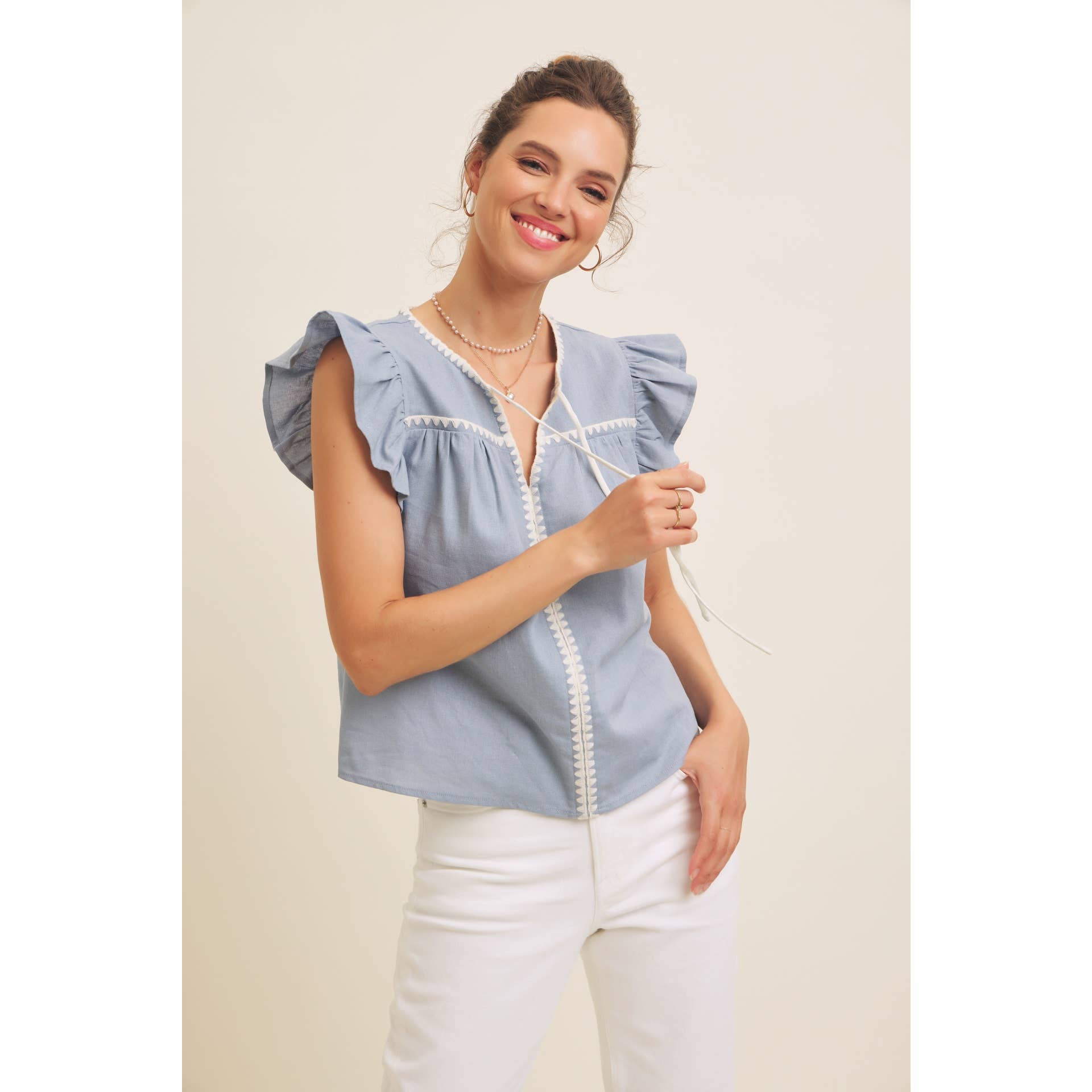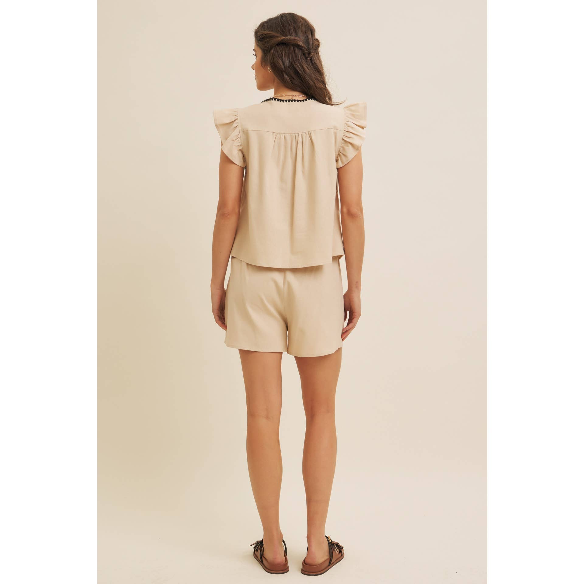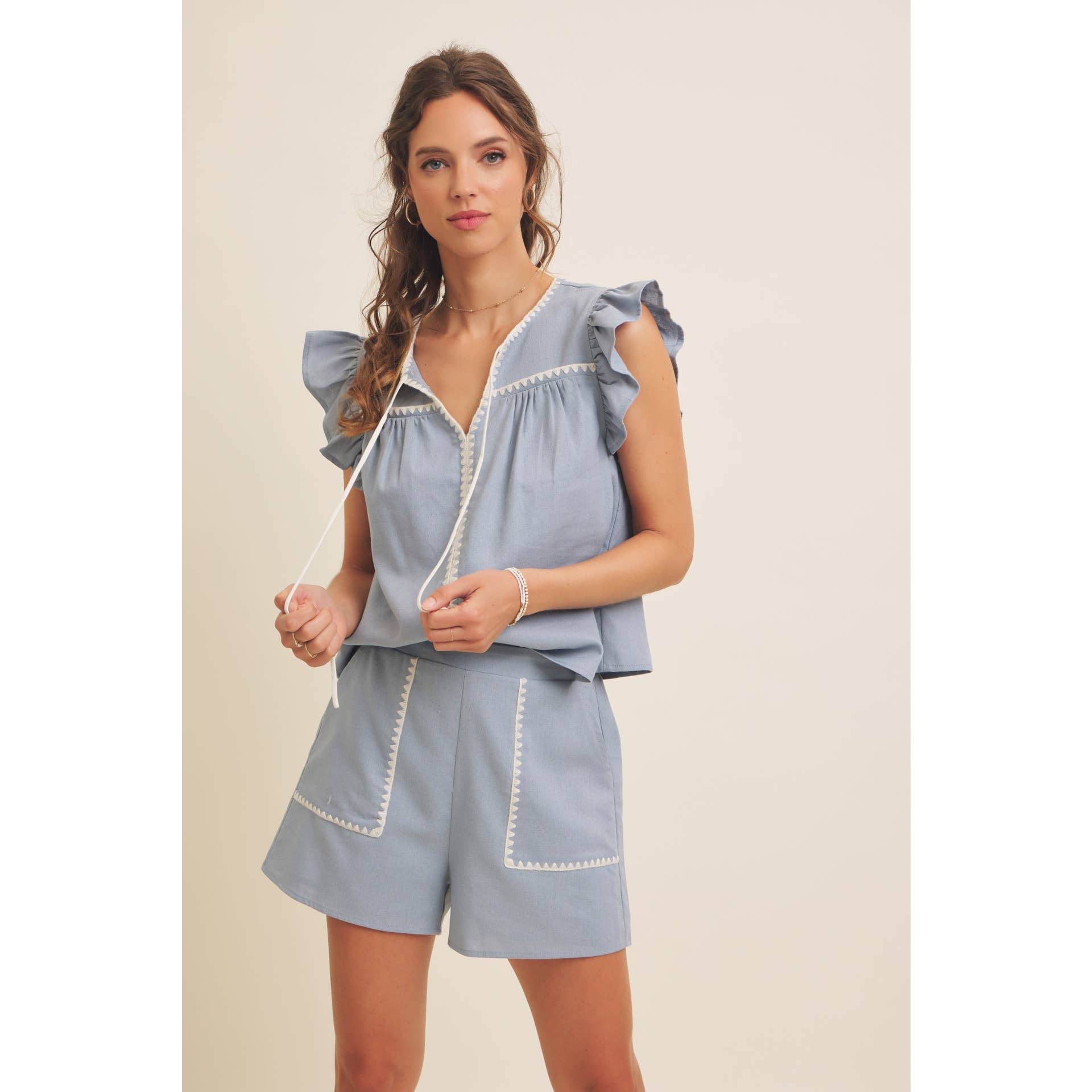 Timeless black with a playful twist—our Boardwalk Breeze Blouse is the perfect mix of elevated and easy. With ruffled sleeves, a relaxed fit, and soft contrast embroidery down the front, this top brings just enough drama without the fuss. The round split neckline features a subtle bow tie for a touch of charm, and she pairs beautifully with denim, white linen, or the matching shorts for a beach-to-brunch look.