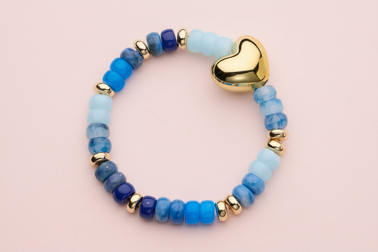 dd a little love (and a lot of color) to your wrist. This stretchy beaded bracelet features glossy pink and blue toned glass beads accented with shiny gold spacers and a bold heart charm at center. Easy to slip on and perfect for stacking, it’s playful enough for everyday wear and cute enough to gift.