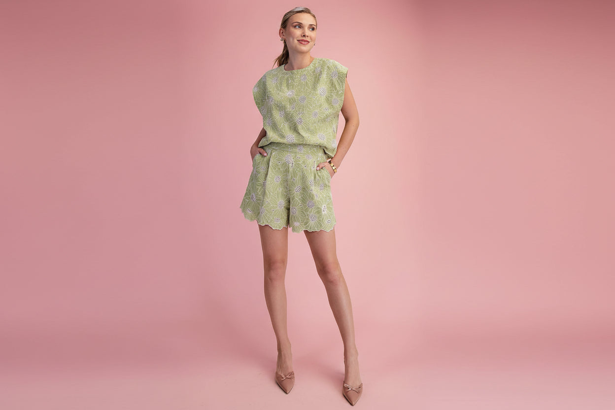 These high-waisted embroidered shorts are the definition of easy summer charm. Designed in a soft sage green with delicate white floral embroidery, they feature a flattering high rise and a scalloped hem for a feminine finish. Fully lined for comfort and coverage, they’re perfect for warm days, brunch dates, or vacation wear. Pair them with the matching top for a standout set or style them with a simple tee for effortless everyday wear.