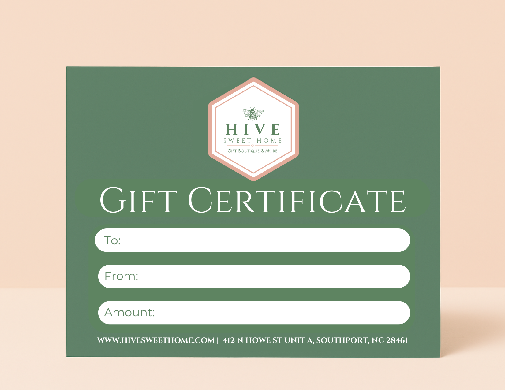 Searching for the perfect gift? Everyone is sure to love a Hive Sweet Home gift certificate! If you are only purchasing the gift certificate, please select "local pickup" to avoid shipping charges. We will email you a digital copy of your gift card.