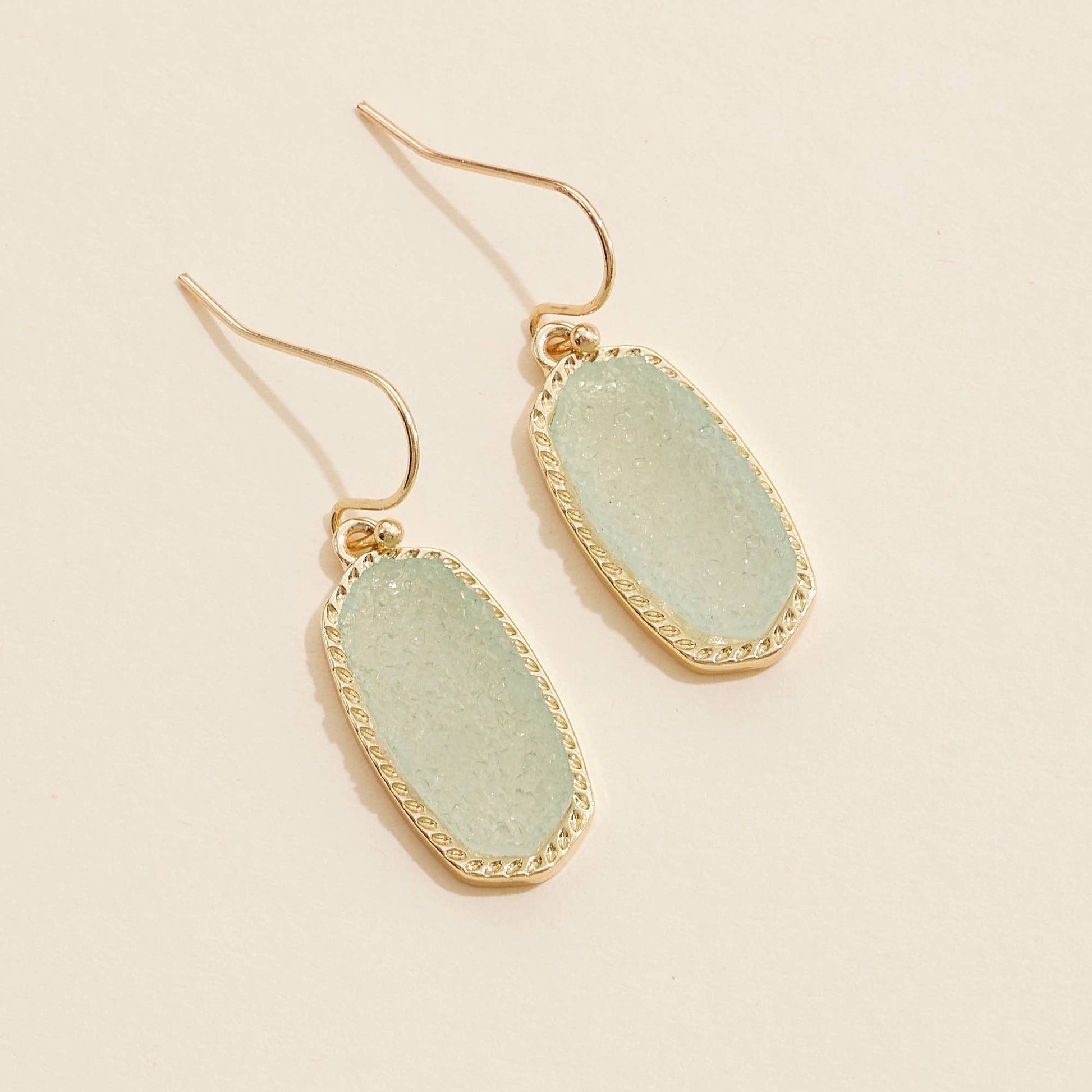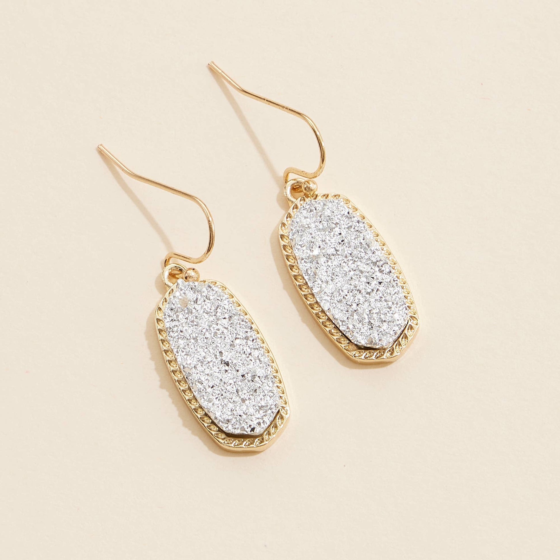 These earrings bring instant shimmer — the kind that makes even a simple outfit feel special. The oval druzy-style stone catches the light beautifully, giving you that soft sparkle that works just as well for brunch as it does for date night. Lightweight, easy to wear, and effortlessly chic, they’re the kind of earrings you’ll reach for again and again.