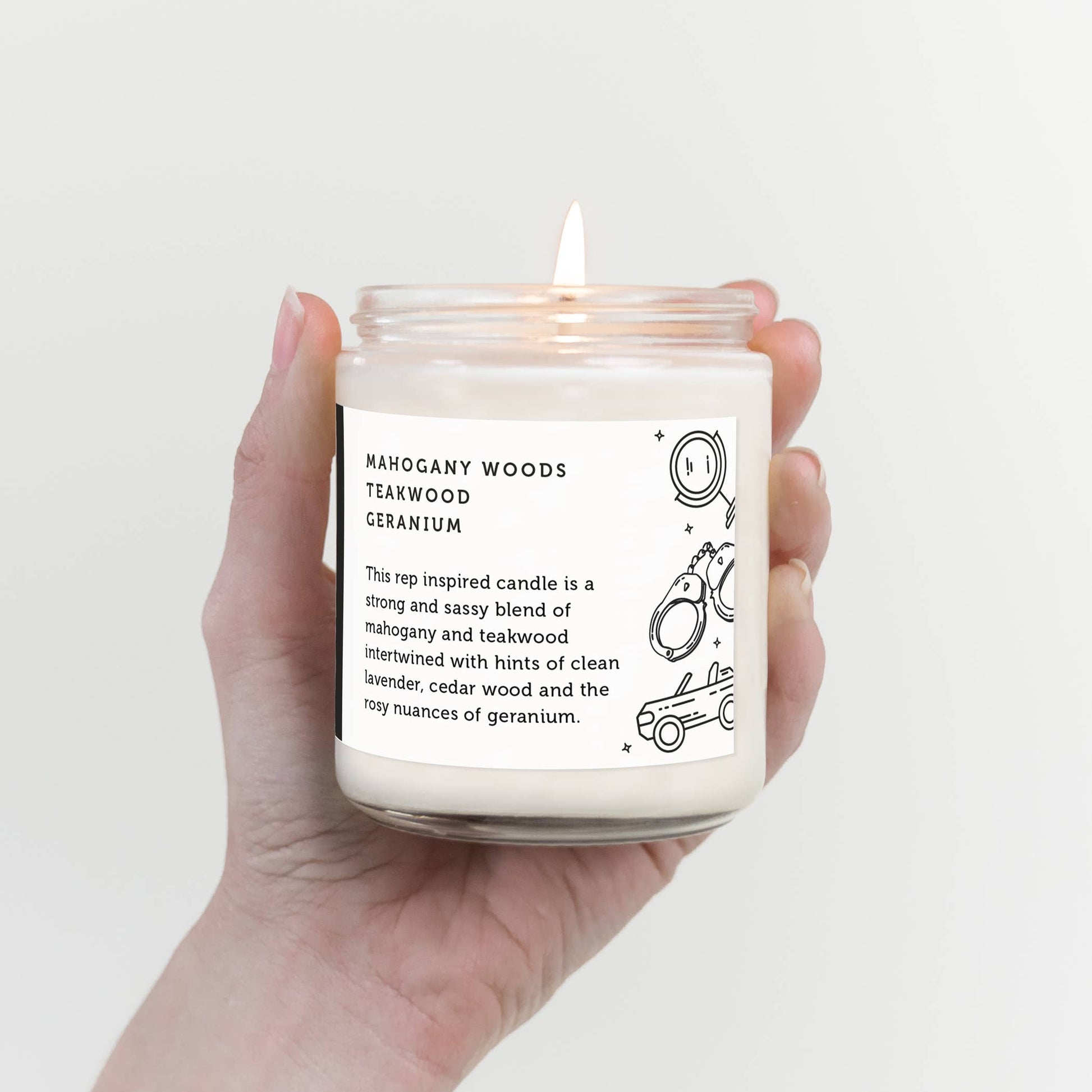 This rep inspired candle is a strong and sassy blend of mahogany and teakwood intertwined with hints of clean lavender, cedar wood and the rosy nuances of geranium.