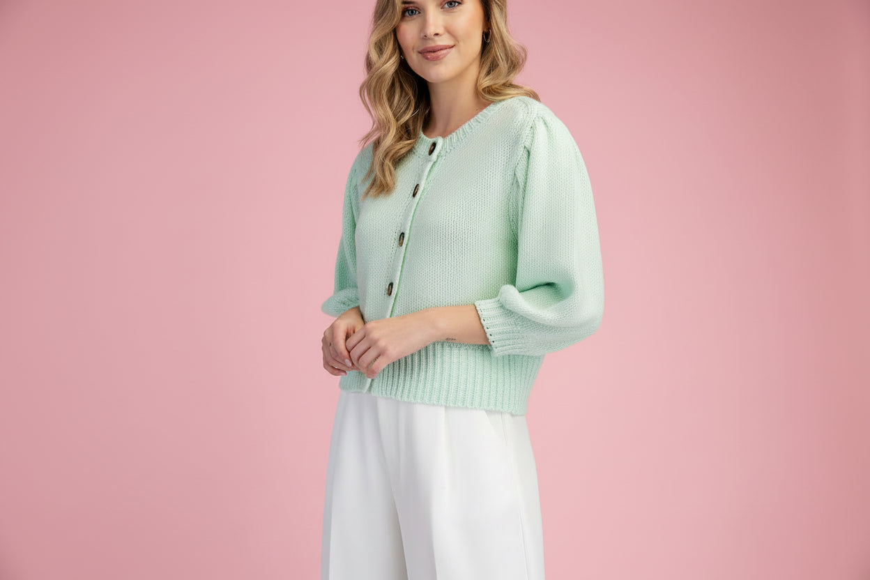 Soft, sweet, and endlessly wearable, this mint cardigan is the perfect lightweight layer for spring and summer. Designed with short puff sleeves and functional tortoise-style buttons, it blends classic charm with an easy, modern fit. The softly textured knit and slightly cropped length make it ideal for pairing with high-waisted shorts, denim, or skirts—buttoned up as a top or worn open as a layering piece.